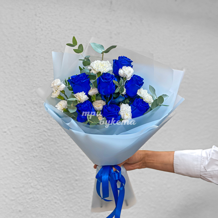 Белые гвоздики и синие розы в букете