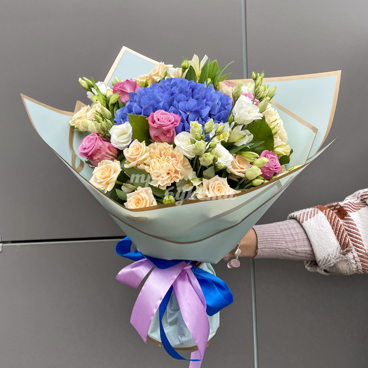 Букет из гвоздик, эустом и гортензии