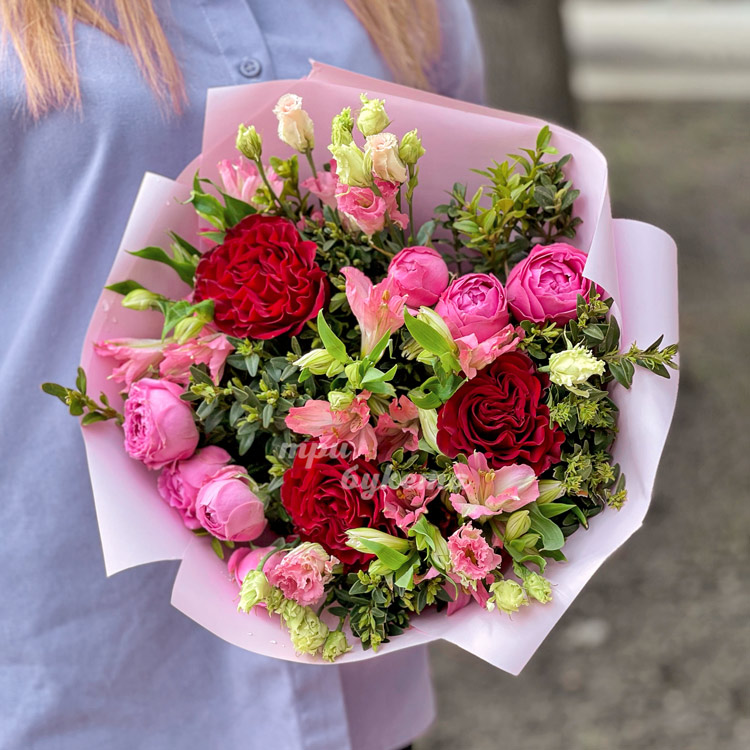 Букет из розовых роз и альстромерий