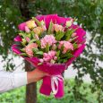 Букет красных альстромерий, роз и зелени