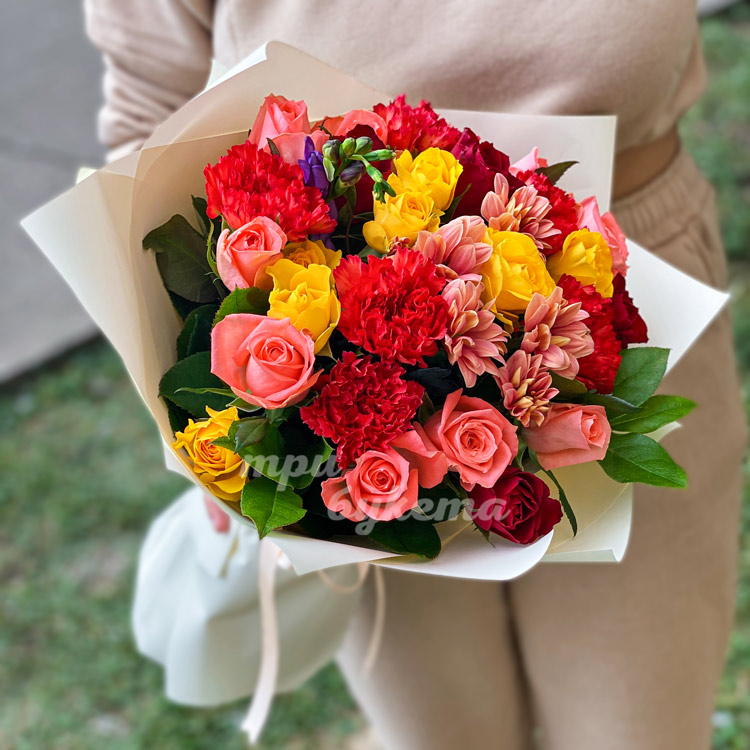 Букет разноцветных роз с гвоздиками
