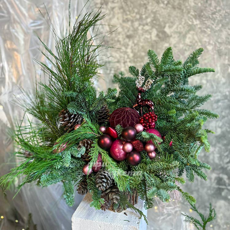 Хвойная композиция с бордовыми игрушками