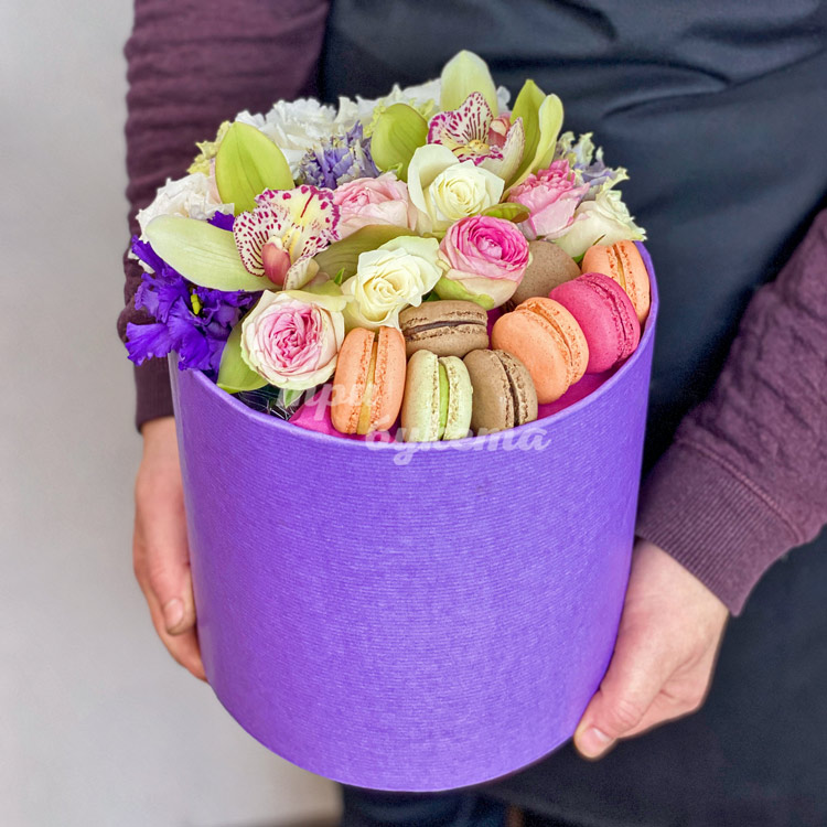 Коробка с 8 макарунами и зелеными орхидеями
