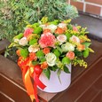 Коробка с эустомами, гвоздиками и розами