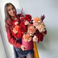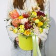 Коробка желтых хризантем, роз и маттиол