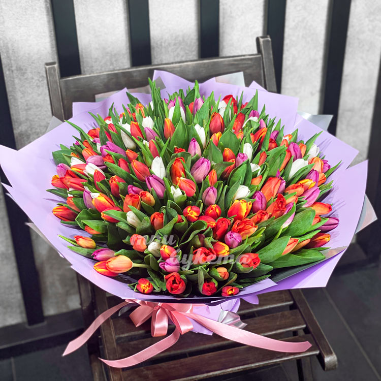 Разноцветный букет из 101 тюльпана