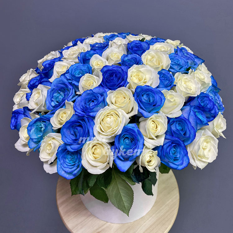 Синие и белые розы в коробке